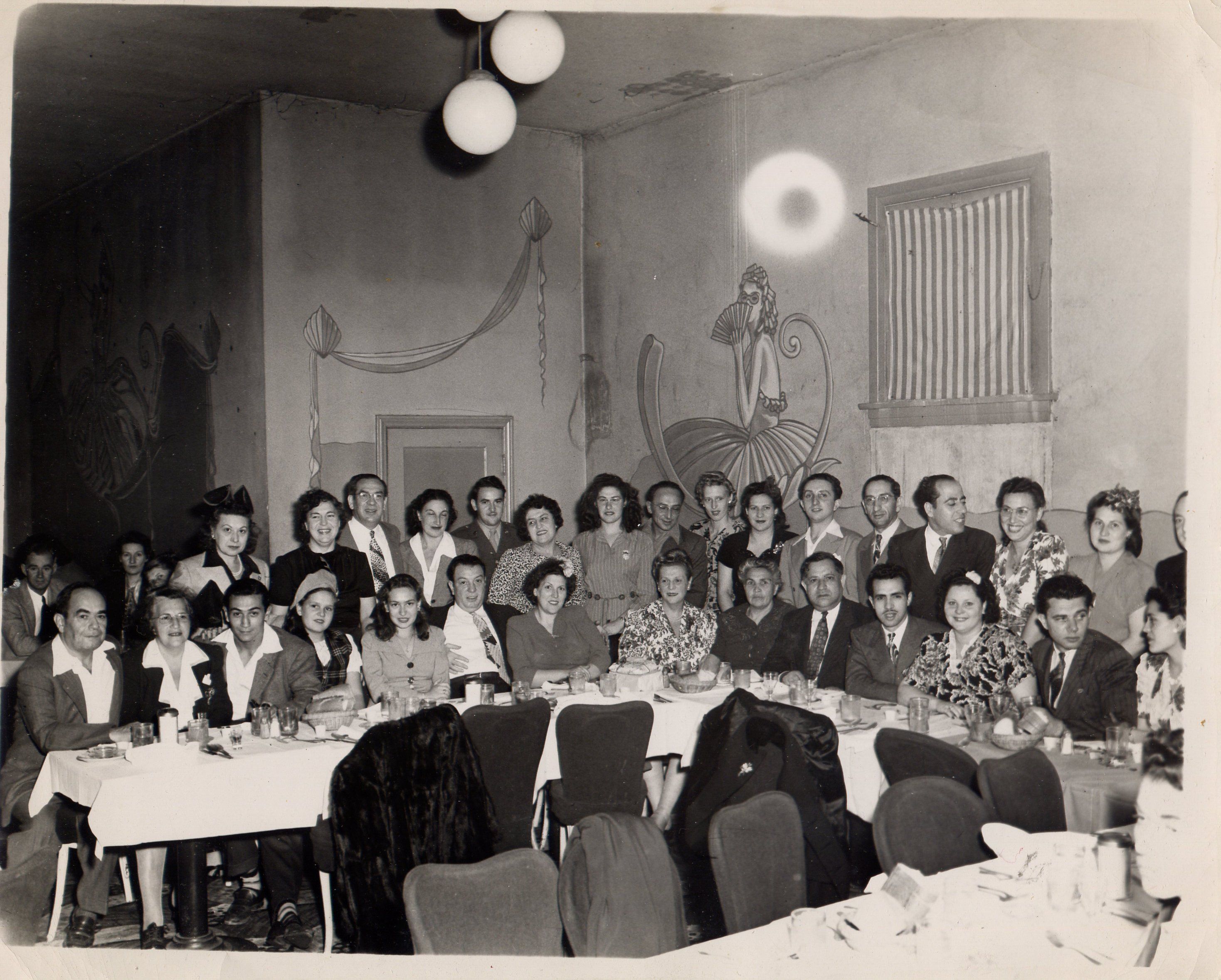 Back row, from left to right (starting with woman with bow in hair): Grace Hauser, Anne Hauser Aronov, Alfred Clifford ("AC") Hauser, Marna Hauser (?), Herbert Gold, Shirley Hauser Rotberg, Molly Rotberg Gold, Gene Jacobs (??), Unknown, Evelyn Weinstock, Julian Weinstock, Mark Aronov, Lester Weinstock, Mildred Farwell Weinstock, Annette Farwell Kahan, Ben Kahan